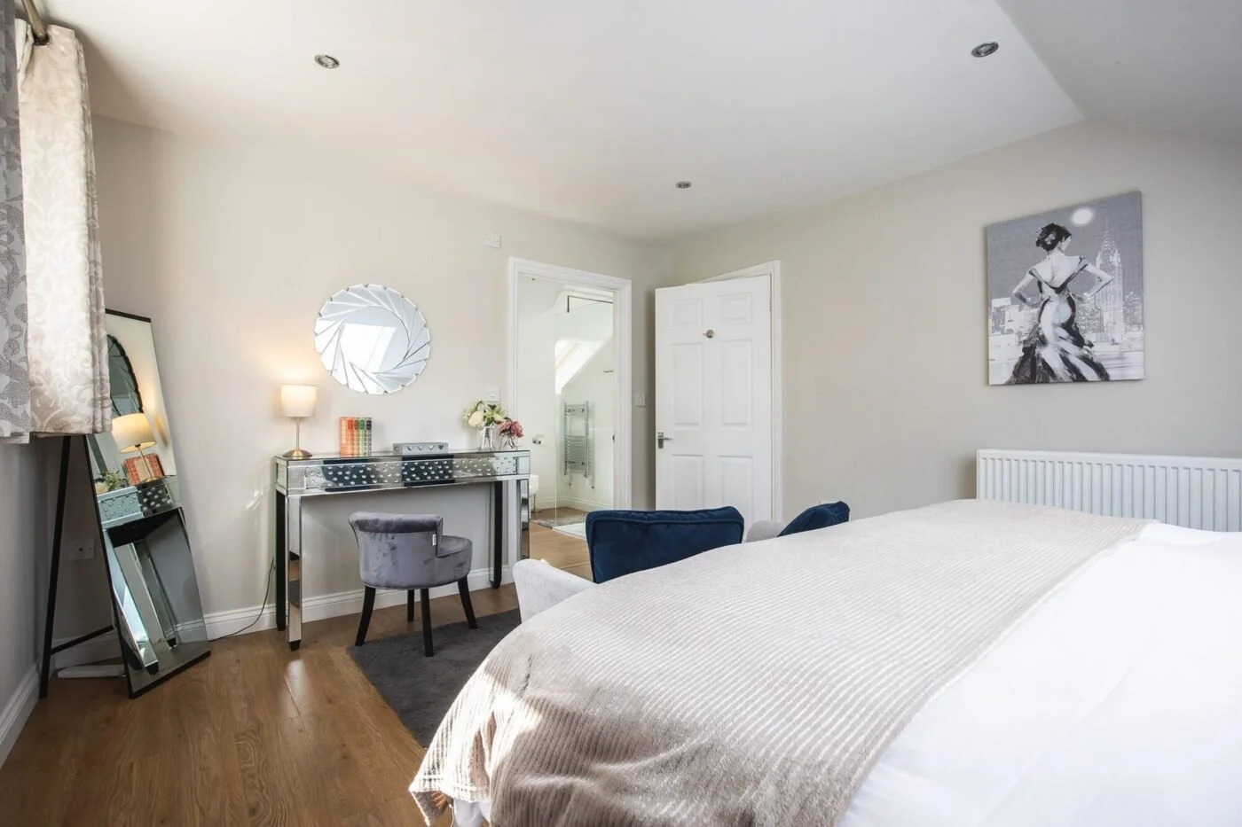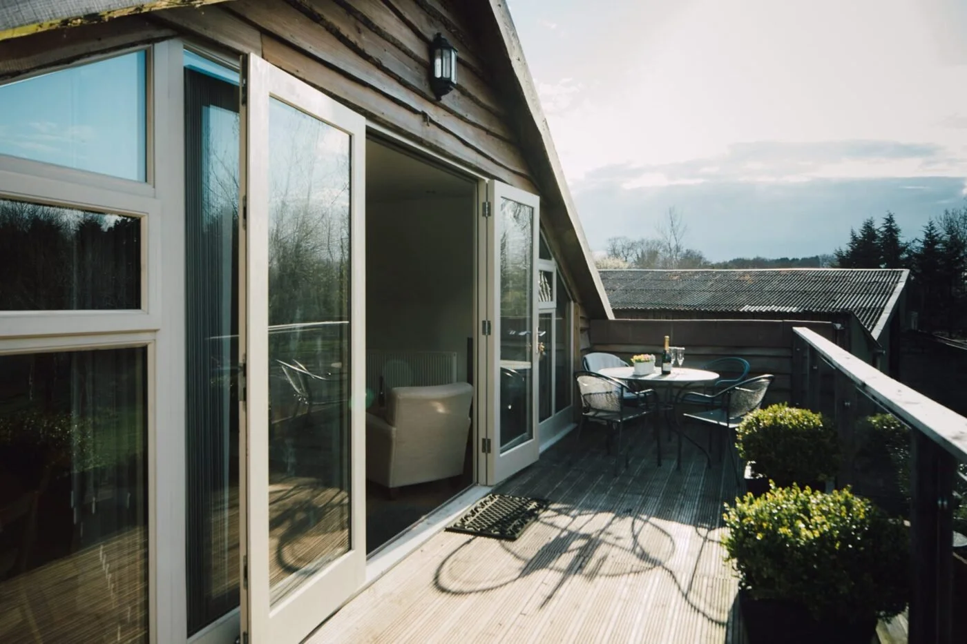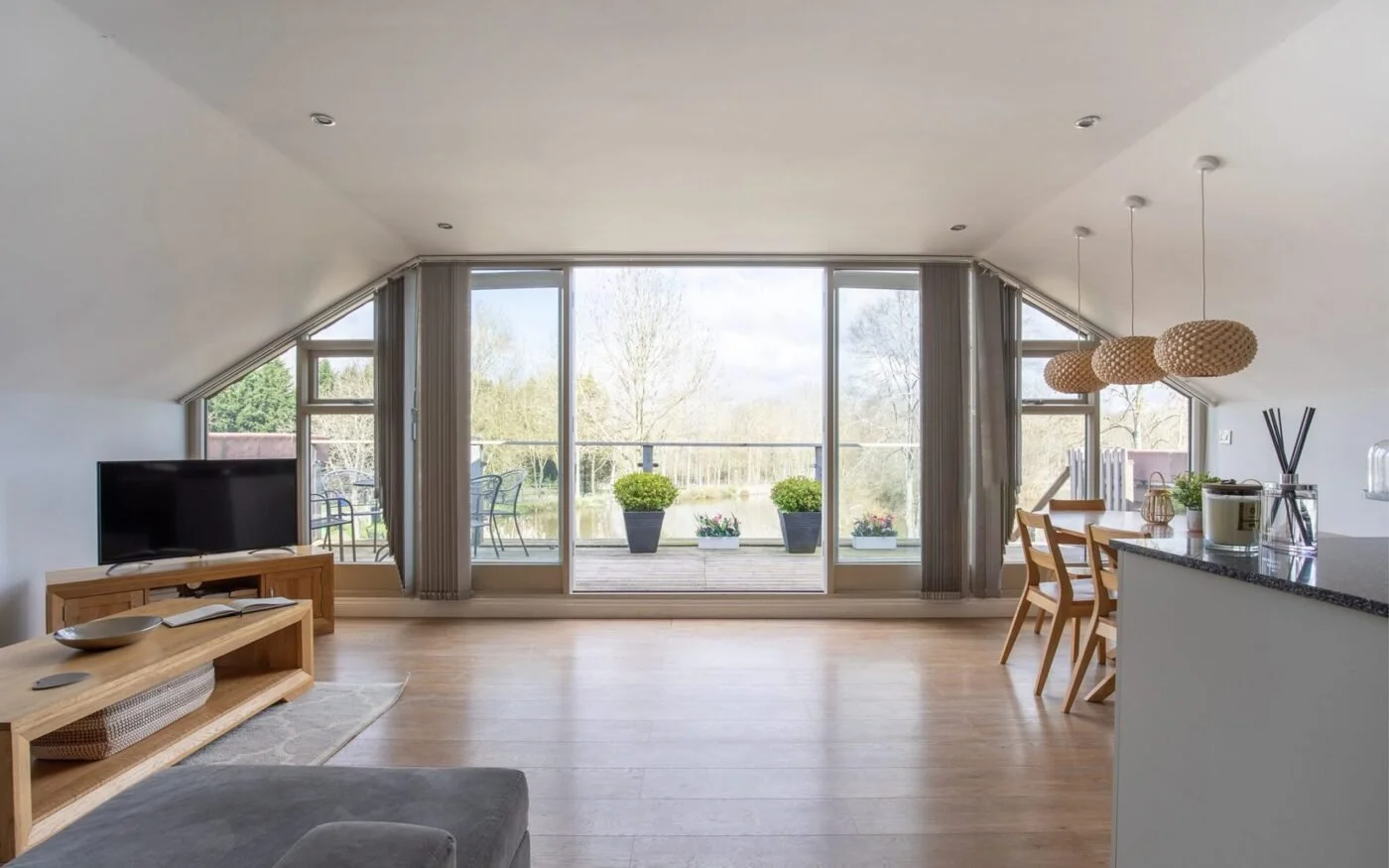 The Swallows is our luxurious, contemporary first-floor penthouse with two bedrooms and two bathrooms, so it's perfect for a larger family or group of up to five guests. One of the stand-out features of this superb lodge is the fabulous panoramic view over the lake from the spacious open-plan kitchen, dining and lounge area which leads onto a decked terrace with glass balcony. On the terrace there's furniture and a barbecue for al fresco dining and a few sundowners. The high-quality kitchen is well-equipped with granite worktops, an American fridge freezer with filtered cold-water dispenser, induction hob, oven, microwave, dishwasher and washing machine. The master bedroom has a generous super king size zip and link bed, which can be made up as twin beds on request, and a Smart TV. The en-suite bathroom and dressing room has a huge walk-in shower with an Italian-style vanity unit, WC, heated electric towel rail and built-in wardrobes. Bedroom two has twin beds and the family bathroom has a large walk-in shower and a heated towel rail.