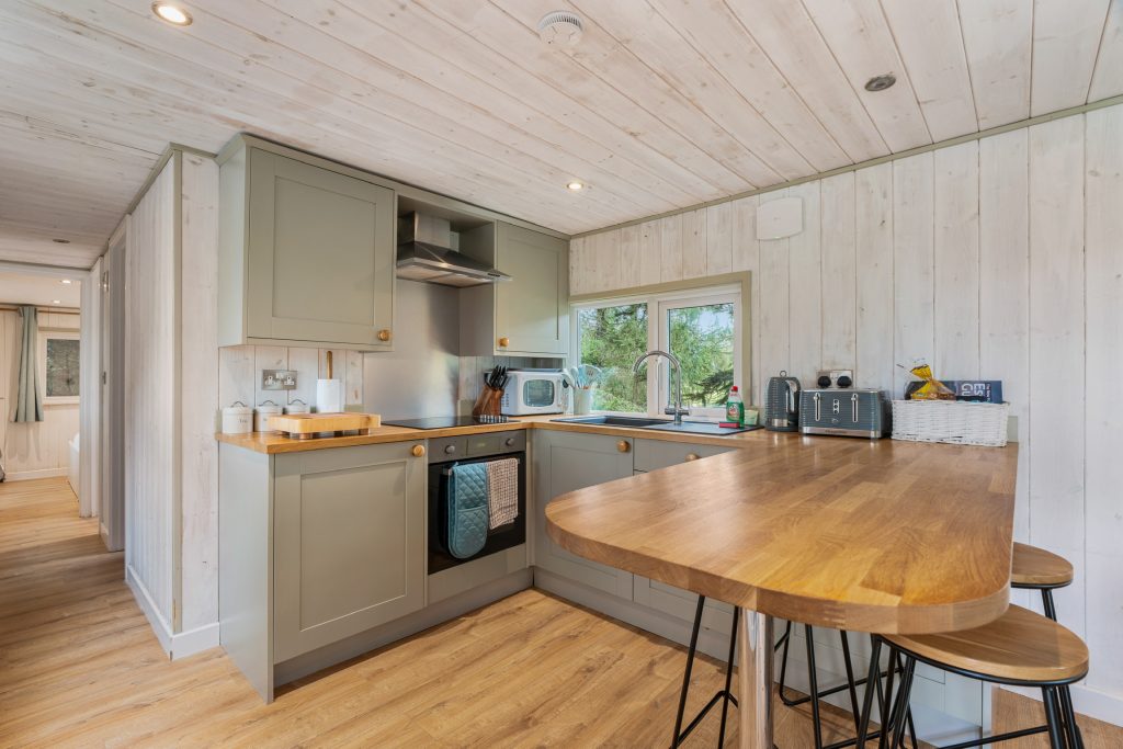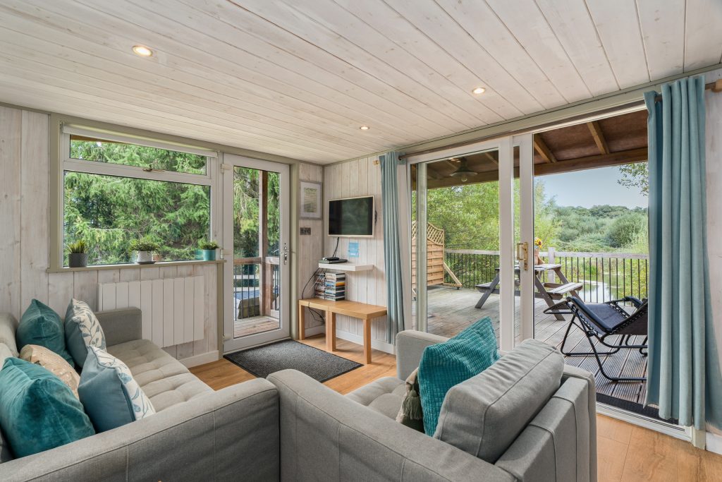 Oak Lodge is our largest Lakeside Lodge, ideal for families, couples wanting more space, or mixed groups. It features open plan kitchen, diner & lounge with patio doors opening to a raised decking that overlooks the lake. The outside space includes a fire pit, BBQ, and lawn area. Inside: 2 bedrooms (1 double, 1 bunk), shower room, and fully equipped kitchen. Dog & child friendly.